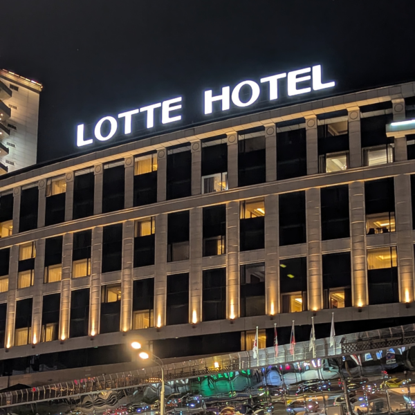 Произвели ремонт крышной вывески LOTTE HOTEL. Заменили пленку на лицевой стороне, заменили электрику и диоды, укрепили каркас.